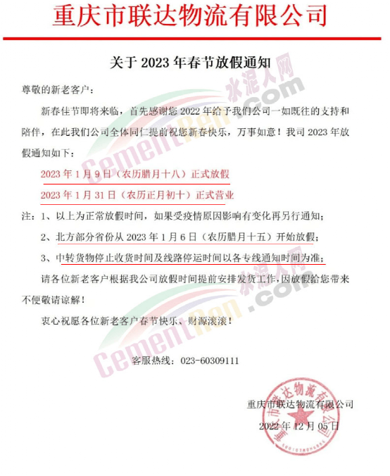 重慶市聯(lián)達(dá)物流有限公司2023年1月9日(農(nóng)歷臘月十八)正式放假,2023年1月31日(農(nóng)歷正月初十)正式營(yíng)業(yè)。如果受疫情原因影響有變化再另行通知;北方部分省份從2023年1月6日(農(nóng)歷臘月十五)開(kāi)始放假;中轉(zhuǎn)貨物停止收貨時(shí)間及線路停運(yùn)時(shí)間以各專(zhuān)線通知時(shí)間為準(zhǔn)。