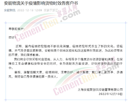 上海安能聚創(chuàng)供應(yīng)鏈管理有限公司通知稱(chēng),近期,國(guó)內(nèi)疫情防控措施不斷優(yōu)化調(diào)整,疫情防控形勢(shì)發(fā)生了新的變化。受疫情、天氣等多重因素影響,安能物流個(gè)別地區(qū)攬收和派送服務(wù)時(shí)效延遲。