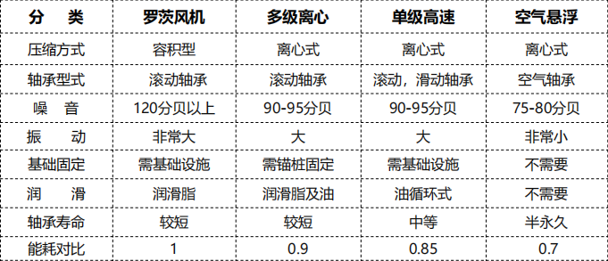 空浮風(fēng)機比傳統(tǒng)羅茨風(fēng)機節(jié)能25%~35%,比多級離心風(fēng)機節(jié)能10%~20%,是目前最節(jié)能、最高效的高速流體設(shè)備。