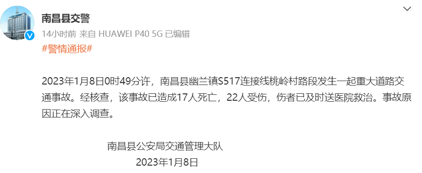 當(dāng)?shù)鼐用裉峁┑墓俜酵▓?bào)稱,2023年1月8日0時(shí)50分,在南昌縣幽蘭鎮(zhèn)桃?guī)X村紅溪章家自然村發(fā)生一起重大交通事故,一輛重型半掛牽引車(屬于樂(lè)平某物流公司),撞上出殯隊(duì)伍,初步掌握,事故已造成17人死亡、22人受傷,傷者已送往醫(yī)院搶救,車輛核載質(zhì)量32700KG,車輛裝載砂石。