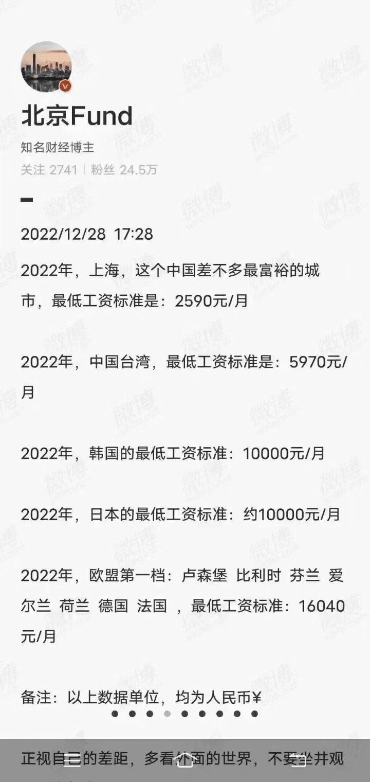 日前,知名財經(jīng)博主北京Fund 在社交媒體發(fā)布了2022年部分國家和地區(qū)的最低工資標(biāo)準(zhǔn)。其中中國最富裕的城市上海最低工資標(biāo)準(zhǔn)是2590元/月;中國臺灣最低工資標(biāo)準(zhǔn)是5970元/月;韓國的最低工資標(biāo)準(zhǔn)10000元/月;日本的最低工資標(biāo)準(zhǔn)約10000元/月;歐盟第一檔盧森堡、比利時、芬蘭、愛爾蘭、荷蘭、德國、法國最低工資標(biāo)準(zhǔn)16040 元/月。