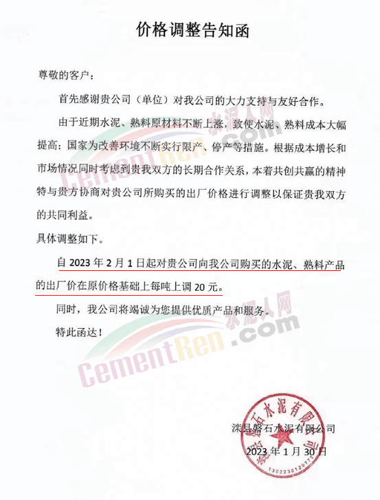 日前,唐山圣龍水泥有限公司、唐山燕東水泥股份有限公司、灤縣磐石水泥有限公司等水泥企業(yè)發(fā)布價(jià)格調(diào)整告知函稱,由于近期水泥、熟料原材料不斷上漲,致使水泥、熟料成本大幅提高;國家為改善環(huán)境不斷實(shí)行限產(chǎn)、停產(chǎn)等措施。根據(jù)成本增長和市場(chǎng)情況自2023年2月1日起對(duì)水泥、熟料產(chǎn)品的出廠價(jià)格上調(diào)20元/噸。