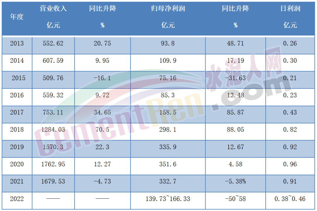 日前,海螺水泥發(fā)布業(yè)績預(yù)告,預(yù)計(jì)2022年實(shí)現(xiàn)歸屬于母公司所有者的凈利潤為139.73億元到166.33億元,與2021年同期相比,減少166.34億元到192.94億元,同比減少50%到58%。照此計(jì)算,同比2021年海螺水泥每天少賺5000萬元左右。