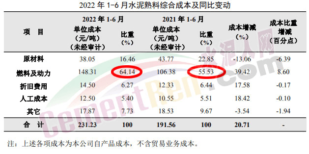 煤價(jià)上漲導(dǎo)致包括海螺水泥在內(nèi)的能源消費(fèi)大戶成本上漲,海螺水泥2022年半年報(bào)顯示,燃料及動力占費(fèi)用成本的64%,而且呈增長的趨勢。2020年的燃料成本占比為53%,2021年是55%。
