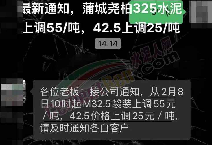 企業(yè)調價通知中提到,為響應陜西省環(huán)保錯峰生產(chǎn)政策,造成公司原材料上漲,生產(chǎn)成本增加,為保證持續(xù)向客戶提供高品質產(chǎn)品和服務經(jīng)公司研究決定自2月8日10時起對公司各型號水泥出廠價格進行調整。調價后,如客戶繼續(xù)提貨則視為同意價格。