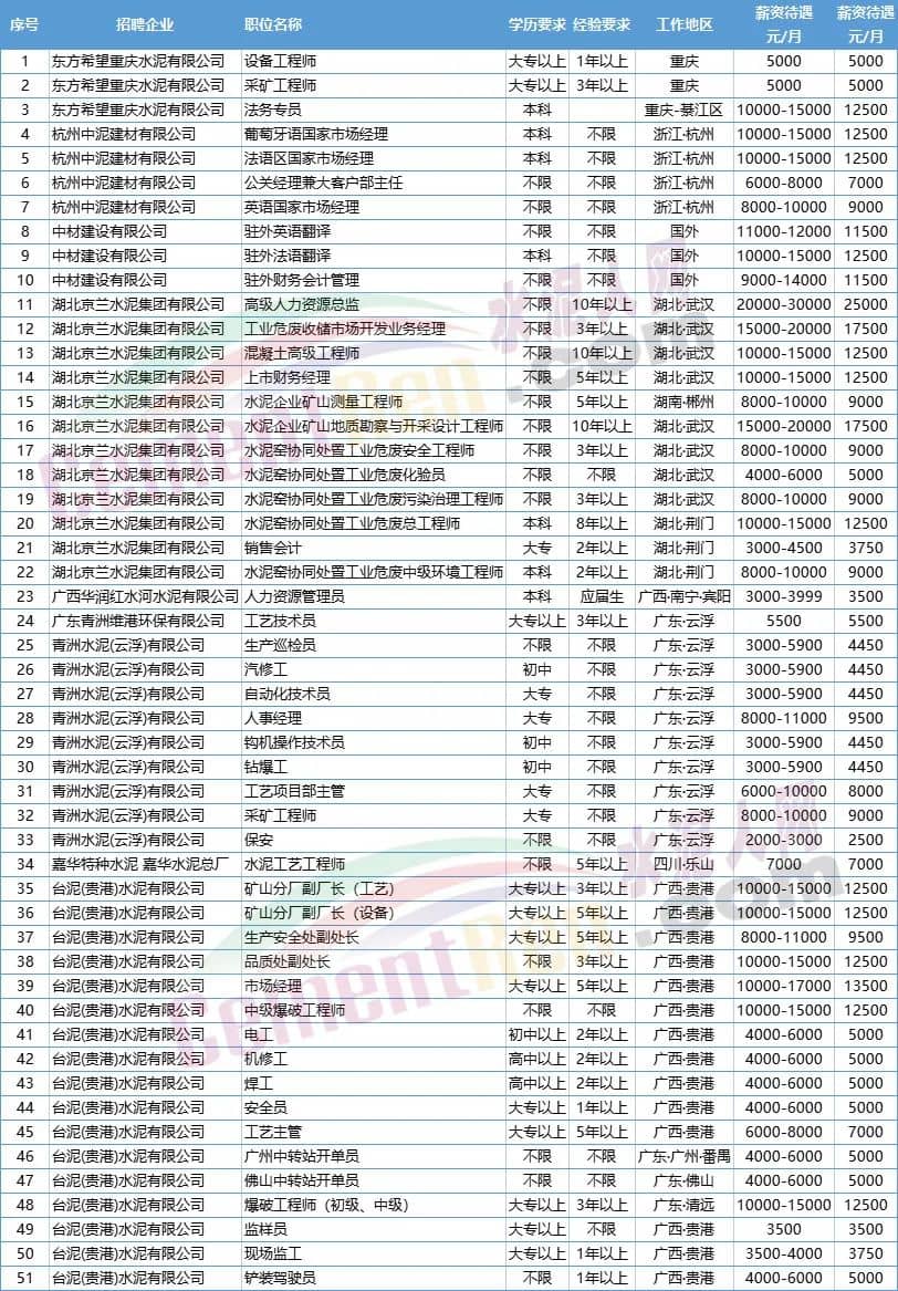 綜合近期發(fā)布招聘信息51條招聘信息可見(jiàn),月薪最高的是湖北京蘭水泥集團(tuán)有限公司招聘職位是高級(jí)人力資源總監(jiān),要求有10年以上經(jīng)驗(yàn),月薪20000-30000元;最低為青洲水泥(云浮)有限公司招聘保安員,月薪2000-3000元;51條招聘信息平均薪資在8691.18元/月;月薪在8000元以下的22條,8000元以上的信息29條。