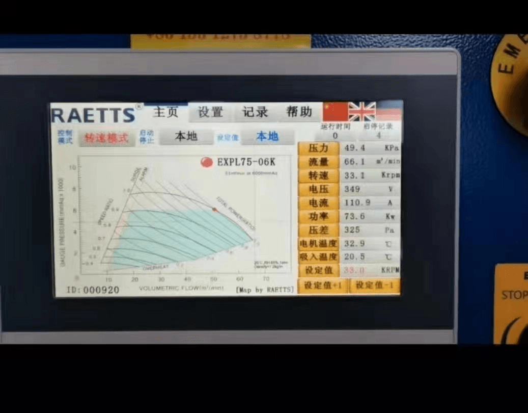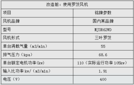 系統(tǒng)情況如下:風(fēng)量:55x1=55m³/min;壓力:68.6kPa;電機功率:105x1=105kW(實際運行功率105kW);比功率:105:55=1.91kW(m³/min)。