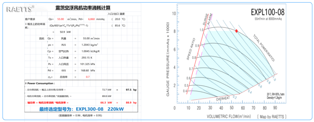 改造前使用的三葉羅茨風(fēng)機工作狀態(tài)為1用0備,常開,運行時間為24h/d連續(xù)運行,根據(jù)設(shè)備工況,該水泥企業(yè)的核算選型如下圖所示: