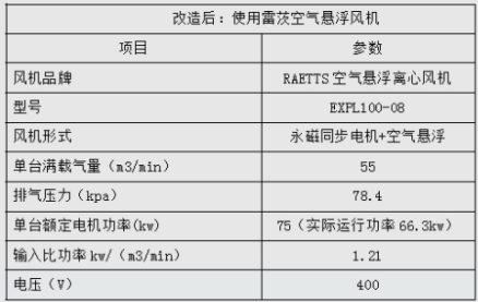 根據(jù)用能單位的現(xiàn)場實際情況,采用高速永磁變頻空氣懸浮離心風(fēng)機情況風(fēng)量:55m³/min;壓力:78.4kPa;電機實際功率:66.3x1=66.3kW(實際運行功率64.5kW);比功率:1.21kW(m³/min)。