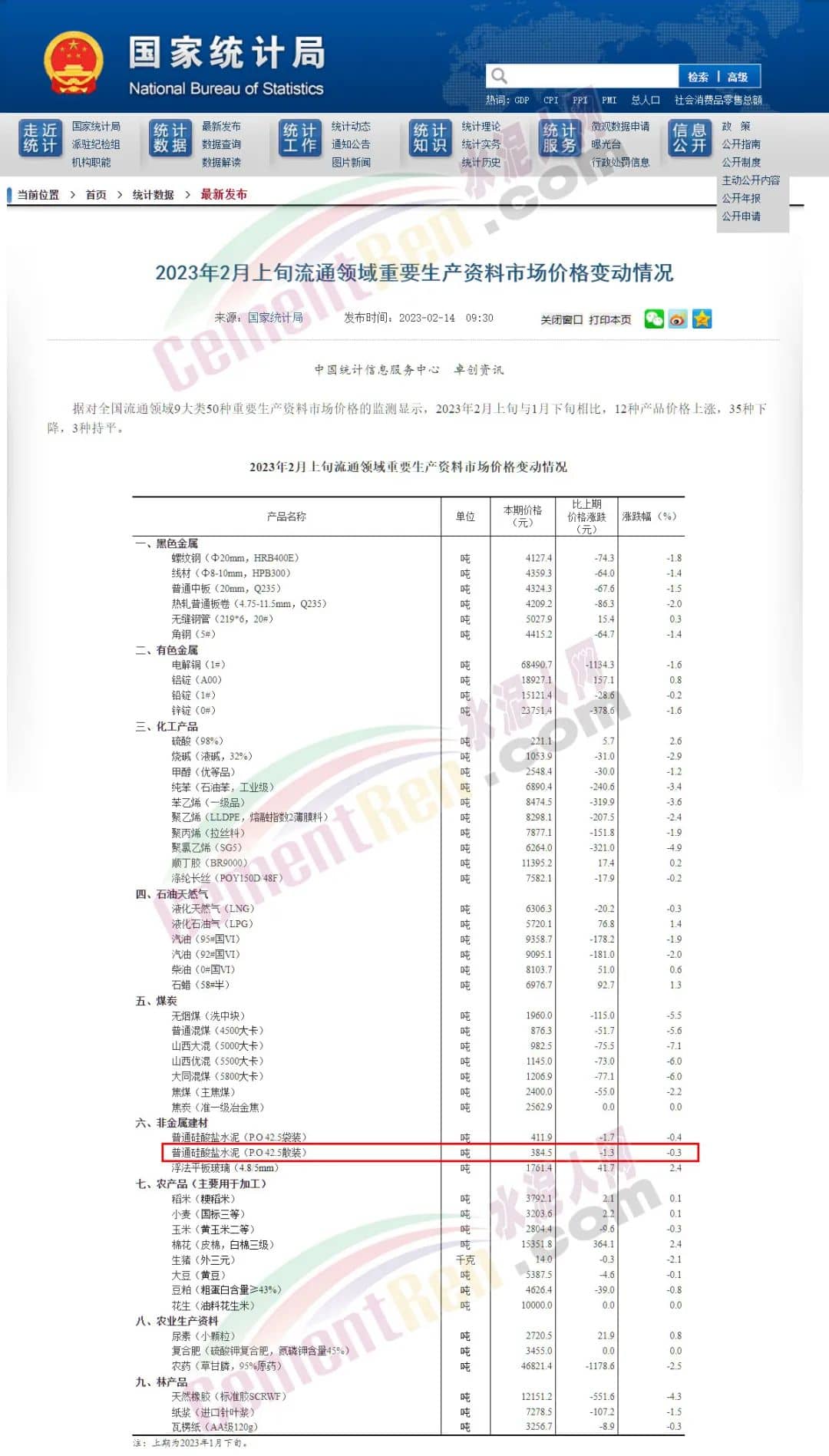 2月14日,國家統(tǒng)計局公布了2023年2月上旬流通領(lǐng)域重要生產(chǎn)資料市場價格變動情況,其中P.O42.5散裝水泥報價384.5元/噸,較1月下旬下跌發(fā)1.3元/噸,跌幅0.3%。同比上年2月份470.1元的報價下跌85.6元/噸,跌幅達18.2%。