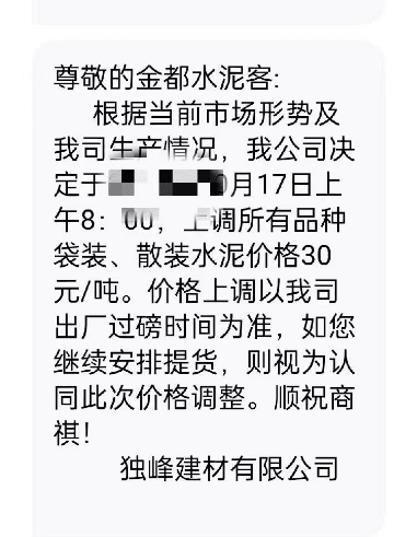 水泥人網(wǎng)通訊員消息,日前獨峰建材有限公司通知,根據(jù)當(dāng)前市場形勢及公司生產(chǎn)情況決定于17日上午8時起,上調(diào)所有品種袋裝、散裝水泥價格30元/噸。經(jīng)銷商提醒“18號還要漲價,這情況少見,想存貨得趕緊了”。