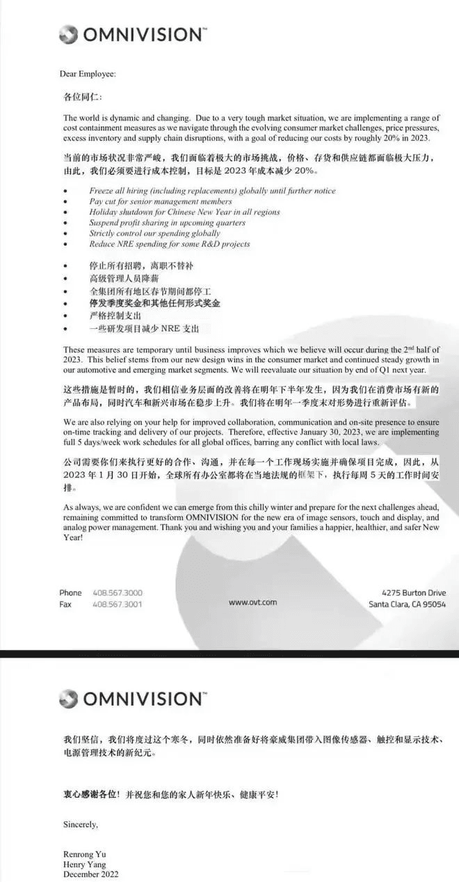 延續(xù)了近兩年的科技公司裁員潮和互聯(lián)網(wǎng)企業(yè)優(yōu)化潮仍在繼續(xù),2023年全球科技業(yè)宣布的裁員計(jì)劃總數(shù)目前已超過10萬人,接近2022年整年的裁員數(shù)量。美國芯片企業(yè)豪威集團(tuán)(OmniVisionGroup)預(yù)警,2023年市場需求不樂觀,運(yùn)營將面臨極大的挑戰(zhàn),宣布采用停招、降薪等一系列措施控制成本,以使明年成本減少20%,并表示這些措施是暫時的,將在明年一季度末對形勢進(jìn)行重新評估。