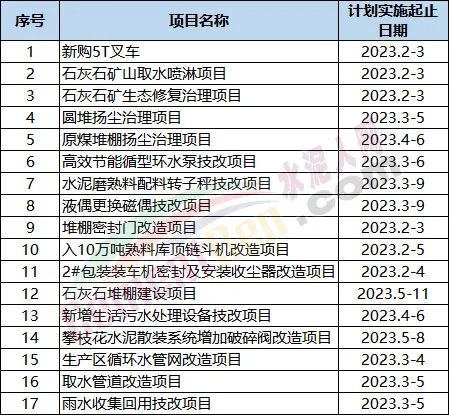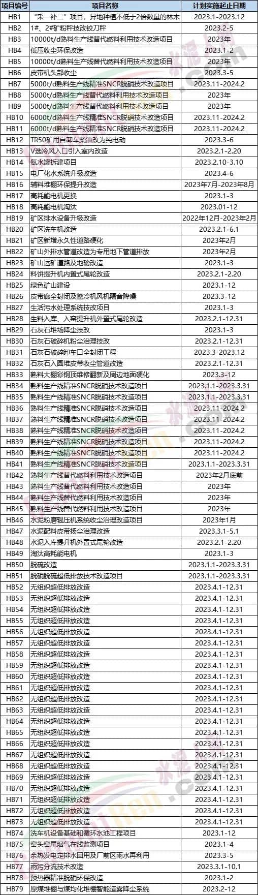 環(huán)保類技改項(xiàng)目涉及低壓收塵環(huán)保改造、精準(zhǔn)SNCR脫硝、脫硝系統(tǒng)升級(jí)改造、無組織超低排放改造 、高耗能電機(jī)淘汰、粉磨系統(tǒng)技改、替代燃料技改、綠色礦山建設(shè)以及堆場(chǎng)降塵、破碎機(jī)揚(yáng)塵治理、粉塵治理、循環(huán)水再利用、脫硫改造、氯水罐拆建、配料皮帶揚(yáng)塵治理、提升機(jī)改造、V選冷風(fēng)機(jī)改造、皮帶廊全封閉、篦冷機(jī)隔音降噪改造、大棚翻新、地面硬化、煙氣在線監(jiān)測(cè)系統(tǒng)、原煤及煤均化棚造霧降塵系統(tǒng)、礦山取水噴淋項(xiàng)目、礦生態(tài)修復(fù)治理項(xiàng)目等。