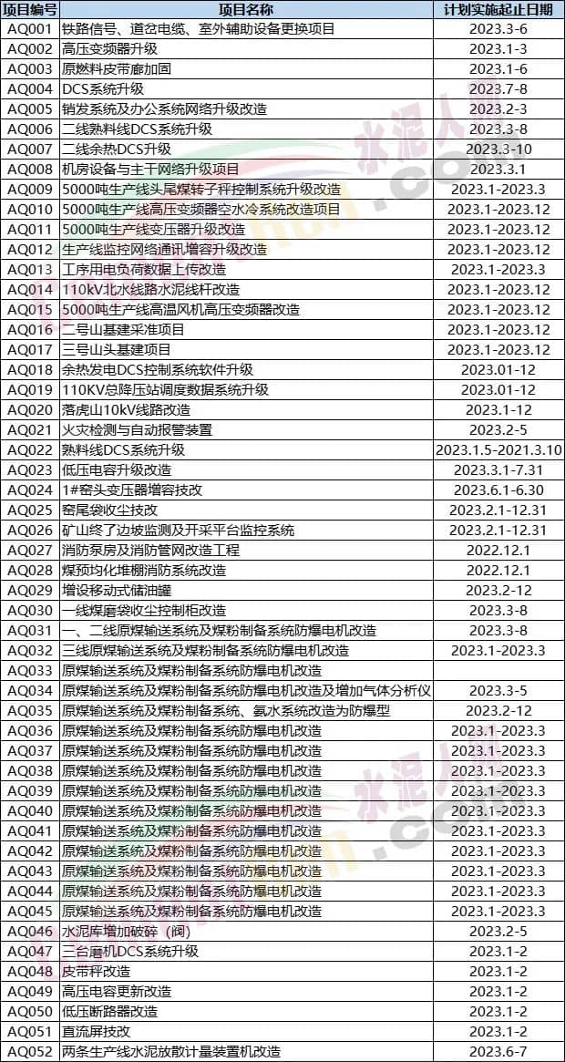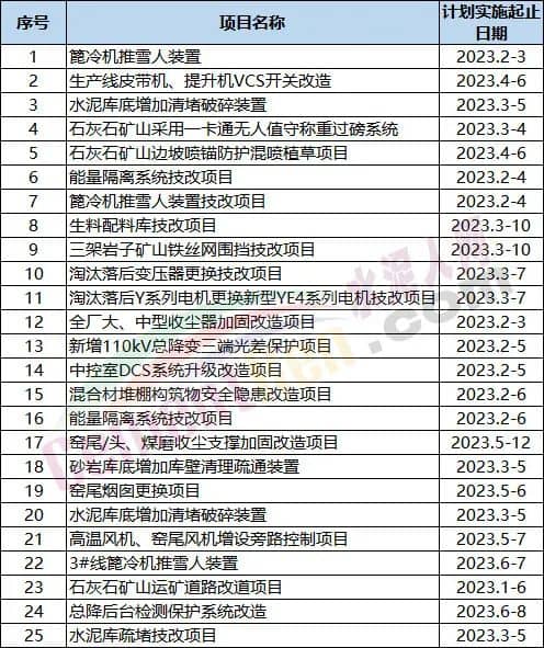 安全類項(xiàng)目涉及變頻器升級(jí)、皮帶廊加固、頭尾煤轉(zhuǎn)子秤控制系統(tǒng)、變頻器水冷系統(tǒng)、安全監(jiān)控網(wǎng)絡(luò)系統(tǒng)、高溫風(fēng)機(jī)改造、火災(zāi)檢測(cè)與自動(dòng)報(bào)警裝置、窯尾收塵器技改、煤粉制備防爆系統(tǒng)、原煤輸送系統(tǒng)及煤粉制備系統(tǒng)防爆電機(jī)改造、篦冷機(jī)推雪人裝置、生產(chǎn)線皮帶機(jī)、提升機(jī)VCS開關(guān)改造、水泥庫(kù)底增加清堵破碎裝置、石灰石礦山采用一卡通無人值守稱重過磅系統(tǒng)、石灰石礦山邊坡噴錨防護(hù)混噴植草項(xiàng)目、能量隔離系統(tǒng)技改項(xiàng)目、生料配料庫(kù)技改項(xiàng)目、淘汰落后變壓器更換技改項(xiàng)目、全廠大、中型收塵器加固改造項(xiàng)目、中控室DCS系統(tǒng)升級(jí)改造項(xiàng)目改造項(xiàng)目、混合材堆棚構(gòu)筑物安全隱患改造項(xiàng)目、水泥庫(kù)底增加清堵破碎裝置、高溫風(fēng)機(jī)、窯尾風(fēng)機(jī)增設(shè)旁路控制項(xiàng)目、石灰石礦山運(yùn)礦道路改道項(xiàng)目、總降后臺(tái)檢測(cè)保護(hù)系統(tǒng)改造、水泥庫(kù)疏堵技改項(xiàng)目以及礦山基建項(xiàng)目等。