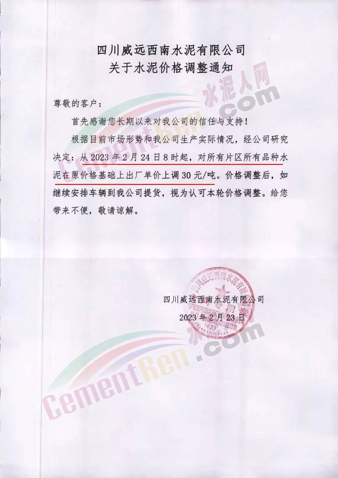 四川威遠(yuǎn)西南水泥有限公司通知,根據(jù)目前市場(chǎng)形勢(shì)和公司生產(chǎn)實(shí)際情況,經(jīng)公司研究決定從2023年2月24日8時(shí)起,對(duì)所有片區(qū)所有品種水泥在原價(jià)格基礎(chǔ)上出廠單價(jià)上調(diào) 30 元/噸。