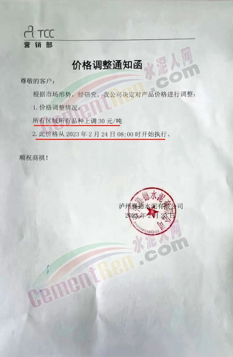 瀘州賽德水泥有聚公司通知從2023年2月24日8時(shí)開(kāi)始,所有區(qū)域所有品種上調(diào)30元/噸。