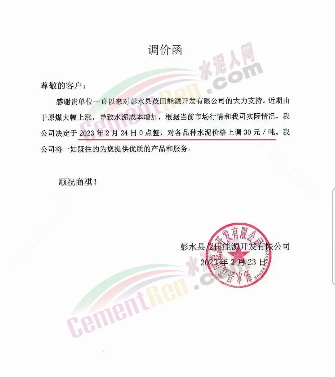 彭水縣茂田能源開(kāi)發(fā)有限公司通知,近期由于原煤大幅上漲,導(dǎo)致水泥成本增加,根據(jù)當(dāng)前市場(chǎng)行情和我司實(shí)際情況,定于2023年2月24日0點(diǎn)整,對(duì)各品種水泥價(jià)格上調(diào)30元/噸。
