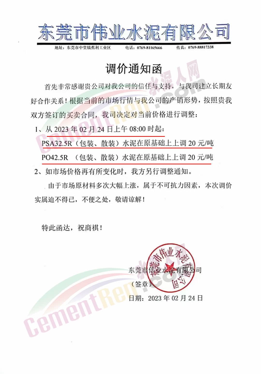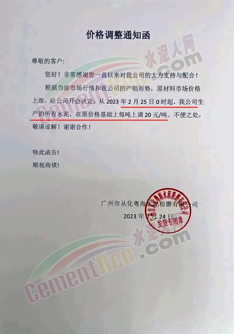 日前,廣州市從化粵海水泥粉磨有限公司通知,根據(jù)當(dāng)前市場(chǎng)行情和公司的產(chǎn)銷形勢(shì),原材料市場(chǎng)價(jià)格上漲,從2023 年2月25日0時(shí)起,公司生產(chǎn)的所有水泥,在原價(jià)格基礎(chǔ)上每噸上調(diào) 20 元/噸。