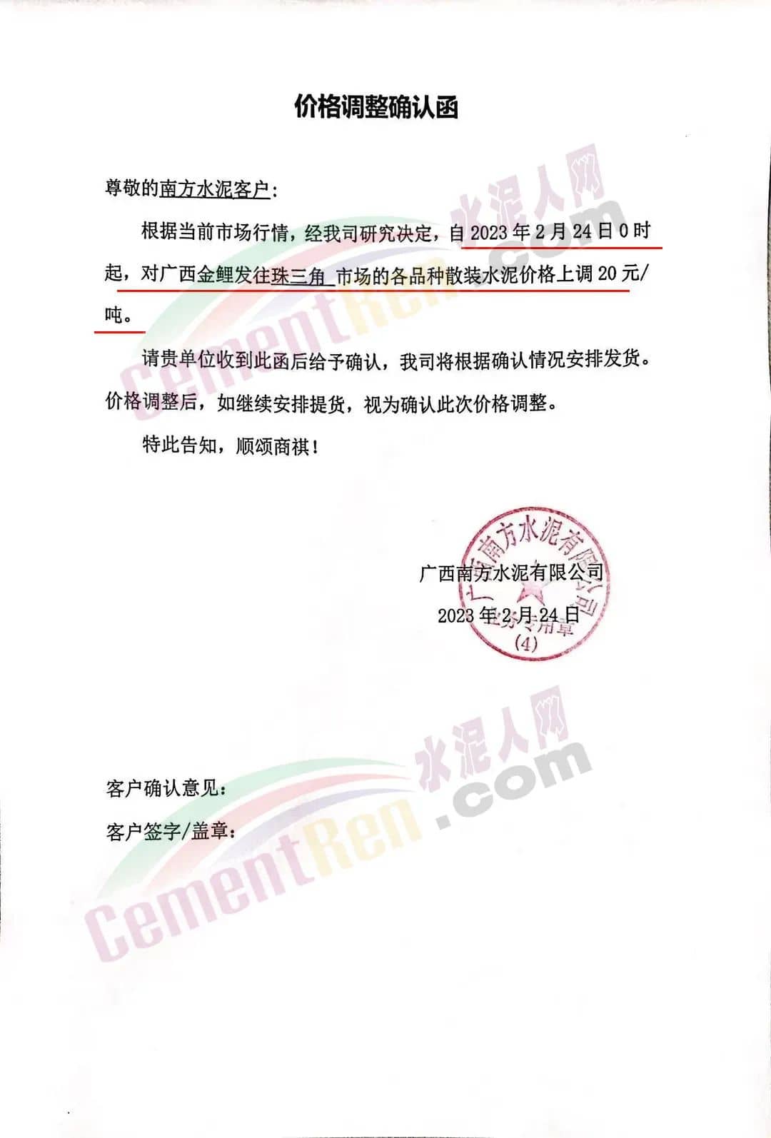 廣西南方水泥有限公司通知,經(jīng)公司研究決定,自2023年2月24日0時(shí)起,對(duì)廣西金鯉發(fā)往珠三角市場(chǎng)的各品種散裝水泥價(jià)格上調(diào)20元/噸。