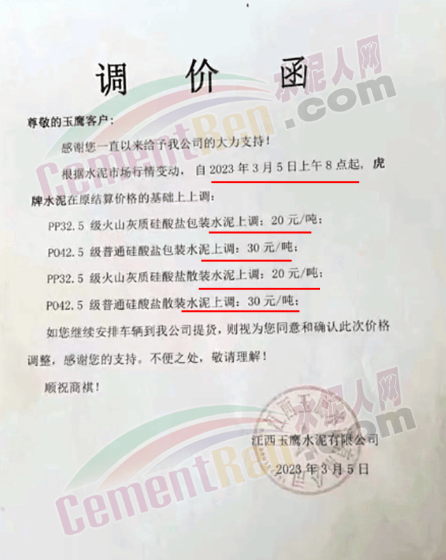湖州昂獅環(huán)保有限公司通知,根據(jù)當(dāng)前市場行情,經(jīng)公司研究決定,公司自2023年3月5日8時(shí)起,32.5包裝、散裝水泥出廠價(jià)在原基礎(chǔ)上上調(diào)20元/噸,42.5包裝、散裝水泥出廠價(jià)在原基礎(chǔ)上上調(diào)30元/噸。