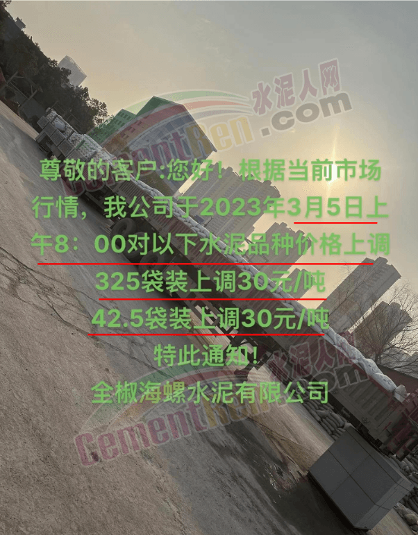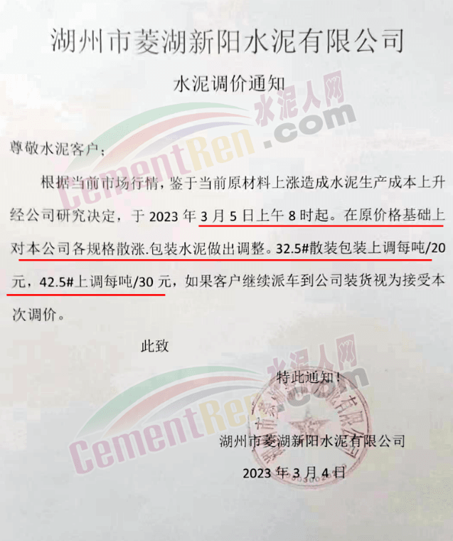 湖州市菱湖新陽水泥有限公司通知,根據(jù)當(dāng)前市場行情,鑒于當(dāng)前原材料上漲造成水泥生產(chǎn)成本上升經(jīng)公司研究決定,于2023年3月5日上午8時(shí)起。32.5水泥上調(diào)20元/噸,42.5水泥上調(diào)30 元/噸。