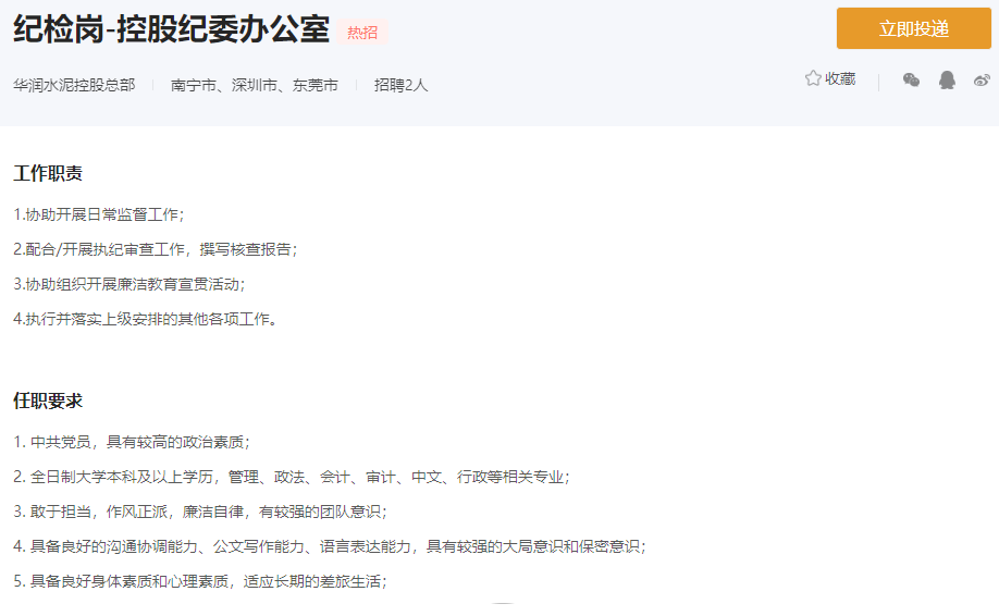 水泥人網(wǎng)注意到,華潤水泥目前熱招崗位分別是技術研發(fā)中心的技術研發(fā)崗和控股紀委辦公室的紀檢崗。