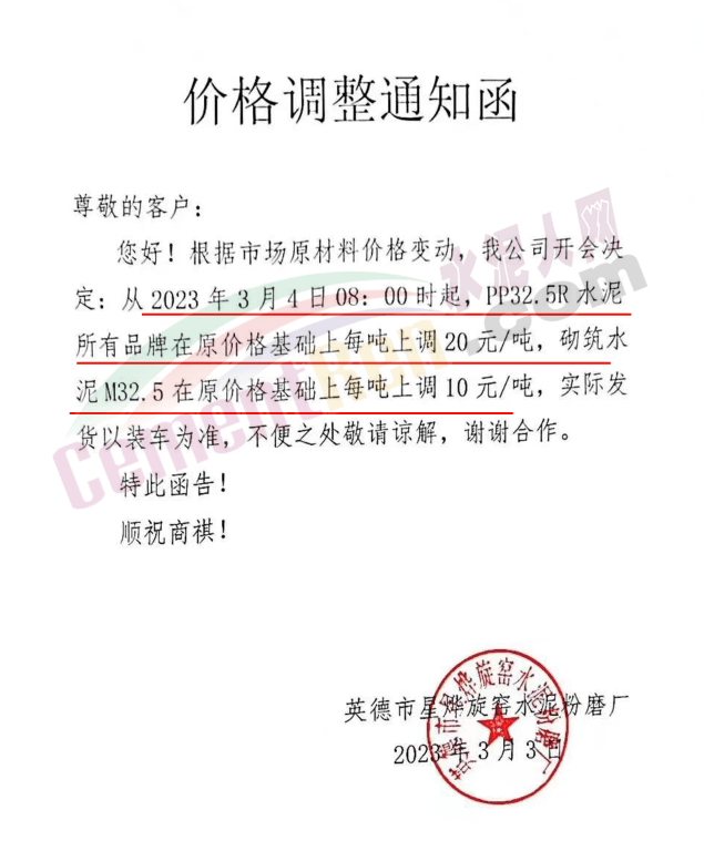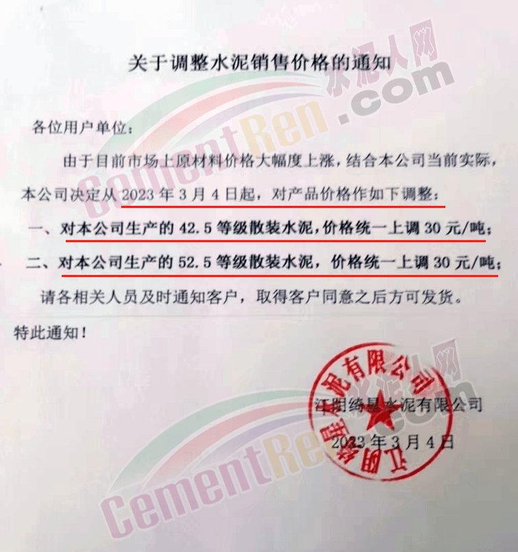 江西萬年青水泥股份有限公司通知,根據(jù)當前市場行情,經(jīng)公司研究決定,自2023年3月3日8時起,公司發(fā)往撫州市場的各品種袋裝、散裝水泥上調(diào)20元/噸。