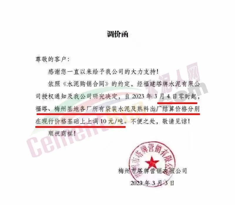 梅州市塔牌營銷有限公司通知,自3月4日零時起,福塔、梅州基地各廠所有袋裝水泥及熟料出廠結算價格上調(diào)10元/噸。