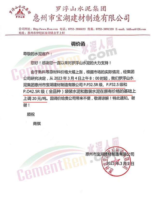 3月4日羅浮山水泥集團惠州市寶湖建材制造有限公司、博羅縣園洲羅浮山水泥有限公司PP32.5R級PP32.5級和P.O42.5R級(全品種)袋裝水泥和散裝水泥上調(diào)20元/噸。企業(yè)曾于2月23日發(fā)函上調(diào)上述標號水泥價格20元/噸。兩次累計上調(diào)40元/噸。