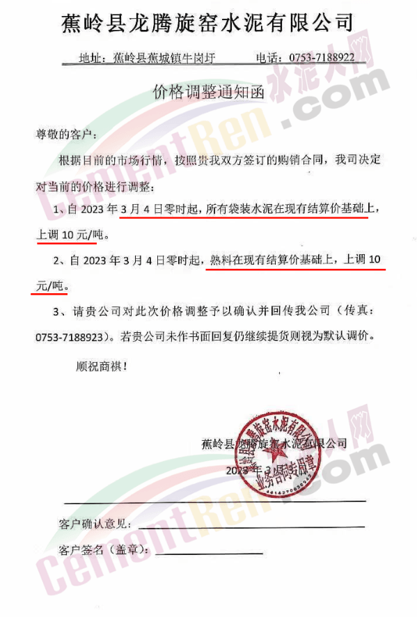 蕉嶺龍騰旋窯水泥通知,3月4日零時起,水泥及熟料價格上調(diào)10元/噸。