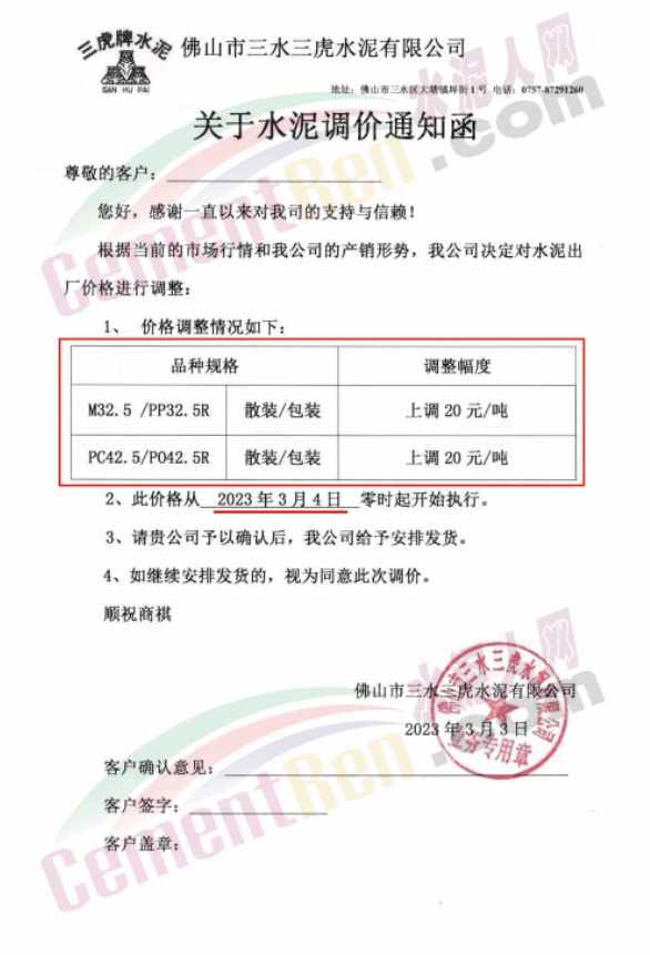 佛山市三水三虎水泥通知,3月4日零時起各標號水泥上調(diào)20元/噸。