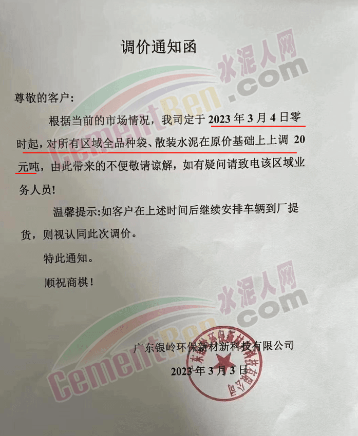 廣東銀嶺環(huán)保新材料科技有限公司通知,3月4日對全區(qū)域水泥價格上調(diào)20元/噸。