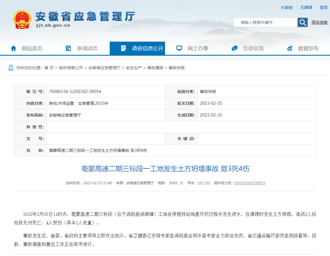 2023年2月25日11時許,亳蒙高速二期三標(biāo)段(位于渦陽縣渦南鎮(zhèn))工地自用攪拌站地基開挖過程中發(fā)生滲水,在清理時發(fā)生土方坍塌,造成3人經(jīng)搶救無效死亡,4人受傷(其中1人危重)。