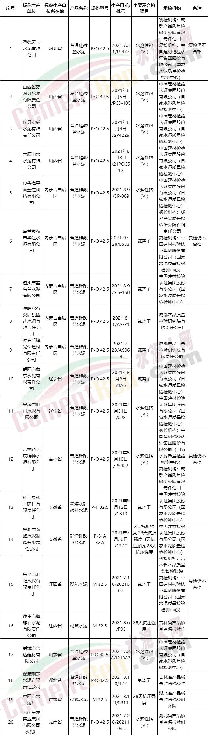 其中,國抽不合格企業(yè)名單共包含21家水泥企業(yè)。主要不合格項目為抗壓、抗折強度以及氯離子和水溶性鉻,且不合格企業(yè)中4家企業(yè)復(fù)檢仍不合格。