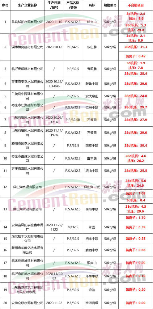 據(jù)水泥人網(wǎng)此前消息,水泥質(zhì)量萬里行組委會對山東、江蘇、安徽等多個水泥大省流通領(lǐng)域第一階段性抽檢中共檢出不合格水泥20批次,不合格率高達23.5%。其中抗壓、抗折強度不合格13個批次,氯離子含量超標(biāo)不合格10個批次。在檢出的不合格水泥中,部分批次28天抗折強度僅為4.3MPa;28天抗壓強度也只有20.6MPa;氯離子達到了1.70,超出國家標(biāo)準28倍,且個別批次水泥出現(xiàn)多個項目不合格。