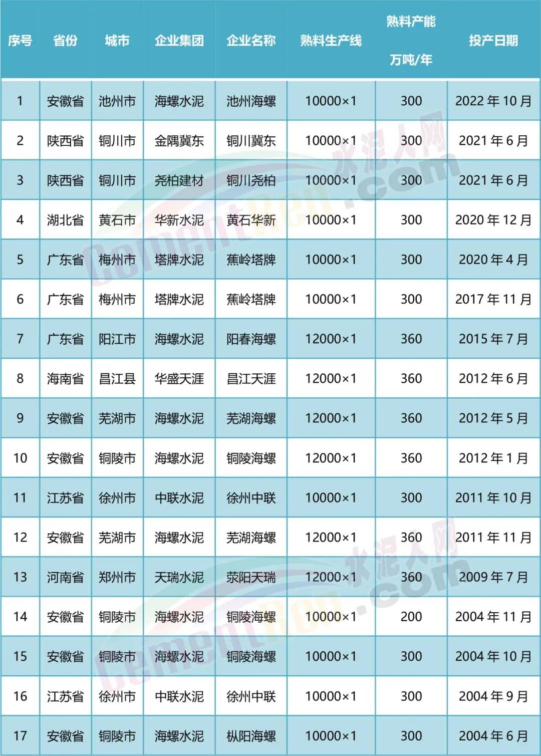 另據(jù)水泥人網(wǎng)不完全統(tǒng)計,目前國內(nèi)已建成投產(chǎn)10000t/d及以上生產(chǎn)線共17條,其中包含陜西銅川市惠塬工業(yè)園2021年6月新投產(chǎn)的冀東水泥和堯柏水泥的兩條萬噸線以及2022年10月建成投產(chǎn)的池州海螺10000t/d生產(chǎn)線。