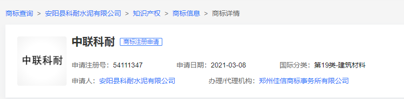 據查詢,“中聯科耐”注冊商標申請人為安陽縣科耐水泥有限公司。