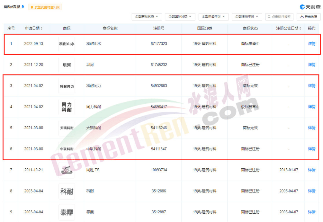 安陽縣科耐水泥有限公司,工業(yè)品生產許可證編號:XK08-001-03670,有效期至2025年1月10日。企業(yè)共有包含科耐山水、科耐同力、同力科耐、天瑞科耐、中聯科耐在內的9條商標申請,與河南、山東區(qū)域幾大知名品牌相關聯。