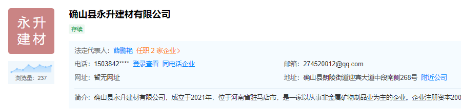 水泥包裝袋上標稱的“確山縣永升水泥有限公司” 未查詢到相關的工商注冊信息。通過模糊查詢找到一家注冊地址位于確山縣朗陵街道迎賓大道中段南側268號的確山縣永升建材有限公司,但未查到相關商標注冊信息,也未查到工業(yè)品生產許可證信息。