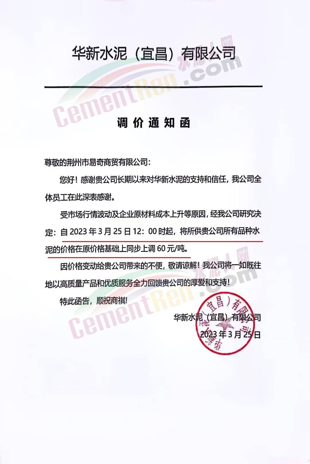 華新水泥(宜昌)有限公司通知,受市場行情波動及企業(yè)原材料成本上升等原因,經公司研究決定,自2023年3月25日12:00時起,將公司所有品種水泥的價格在原價格基礎上同步上調60元/噸。