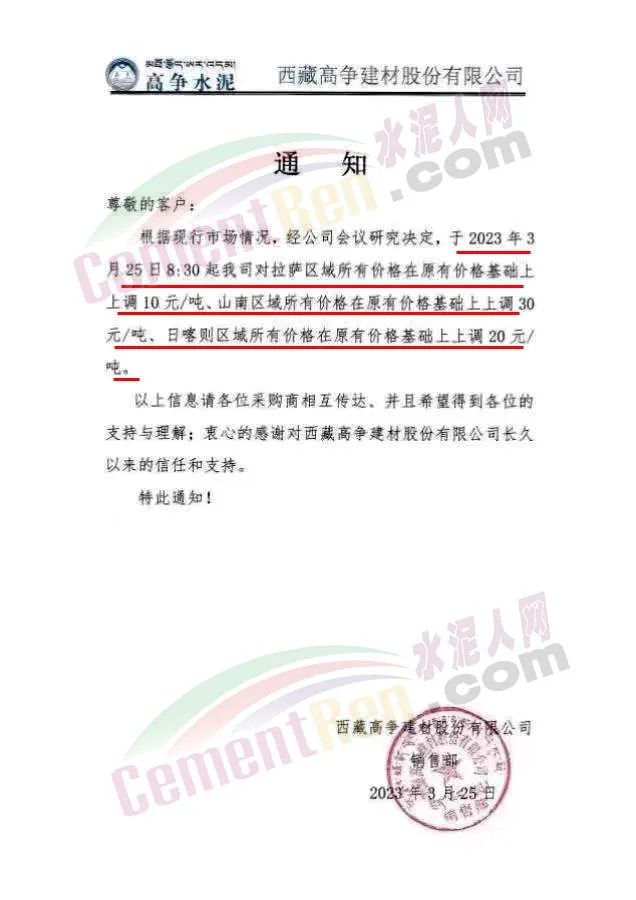 西藏高爭建材股份有限公司通知,根據現行市場情況,經公司會議研究決定,于2023年3月25日8:30起公司對拉薩區(qū)域所有價格在原有價格基礎上上調10元/噸;山南區(qū)域所有價格在原有價格基礎上上調30元/噸、日喀則區(qū)域所有價格在原有價格基礎上上調20元/噸。