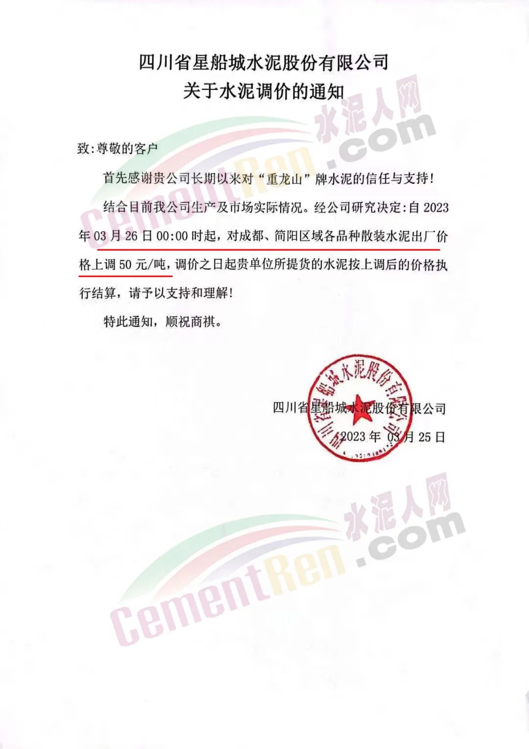四川星船城水泥股份有限公司通知,自2023年03月26日0時起,對成都簡陽區(qū)域各品種散裝水泥出廠價格上調50元/噸。