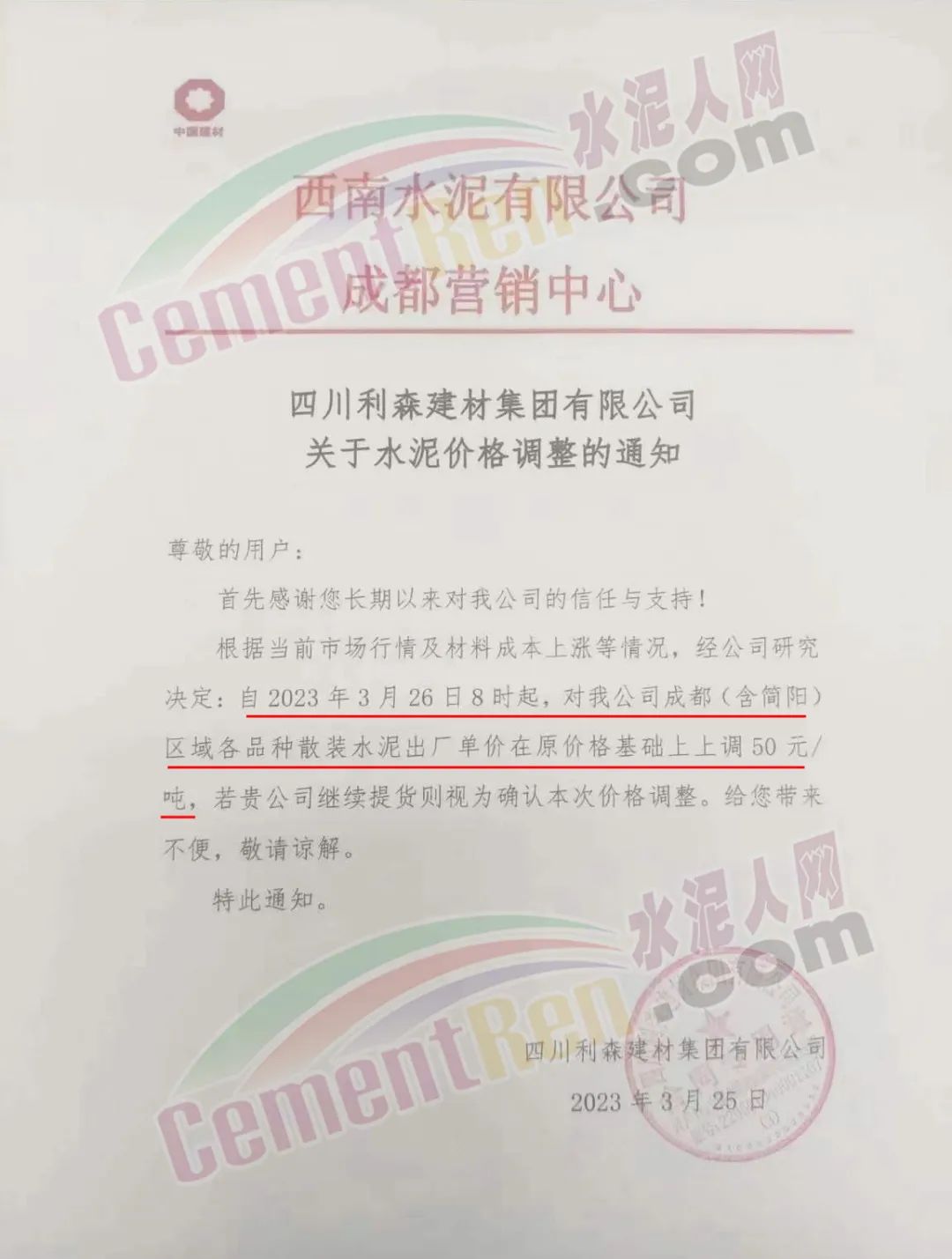 四川利森建材集團有限公司通知,結合當前市場和公司生產情況,經公司研究,決定從2023年3月25日0:00起,對銷往成都(含簡陽)區(qū)域的所有系列袋裝水泥出廠單價上調50元/噸。