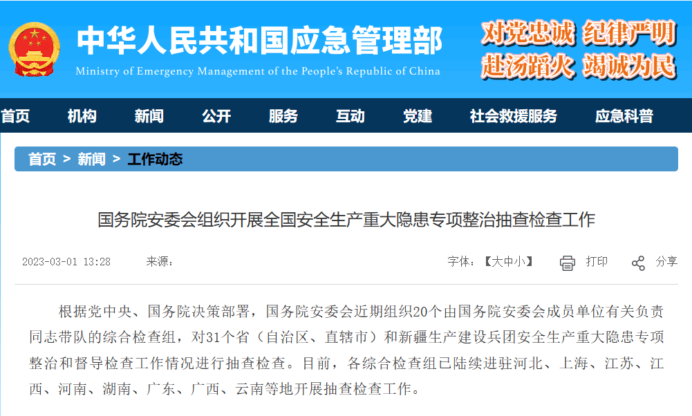 近日,從應(yīng)急管理部網(wǎng)站獲悉,根據(jù)黨中央、國務(wù)院決策部署,國務(wù)院安委會(huì)近期組織20個(gè)由國務(wù)院安委會(huì)成員單位有關(guān)負(fù)責(zé)同志帶隊(duì)的綜合檢查組,對31個(gè)省(自治區(qū)、直轄市)和新疆生產(chǎn)建設(shè)兵團(tuán)安全生產(chǎn)重大隱患專項(xiàng)整治和督導(dǎo)檢查工作情況進(jìn)行抽查檢查。目前,各綜合檢查組已陸續(xù)進(jìn)駐河北、上海、江蘇、江西、河南、湖南、廣東、廣西、云南等地開展抽查檢查工作。