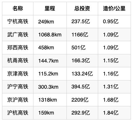 高鐵的成本有多高?我們根據(jù)公開(kāi)的資料,整理的部分高鐵成本,如下表所示。
