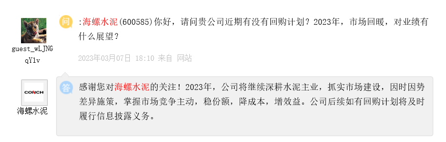 3月27日晚間,海螺水泥發(fā)布2022年年報,或因其業(yè)績下滑幅度較大,多位投資者在上市平臺針對海螺水泥市值蒸發(fā)1000多億以及2023年業(yè)績發(fā)展、采購成本、海外投資、產(chǎn)品細(xì)節(jié)提問,甚至的投資者表示希望海螺水泥繼續(xù)通過價格戰(zhàn),將近年高杠桿擴(kuò)張的同行拖死。28日海螺水泥上市公司集中回復(fù)了多位投資者提問。
