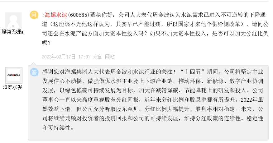 海螺水泥回復(fù)稱,“十四五”期間,公司將堅定主業(yè)發(fā)展信心不動搖,做強(qiáng)做優(yōu)水泥主業(yè)及上下游產(chǎn)業(yè)鏈,推動環(huán)保、新能源、數(shù)字產(chǎn)業(yè)協(xié)調(diào)發(fā)展,以綠色低碳可持續(xù)發(fā)展為目標(biāo),加大在減污降碳、節(jié)能降耗上的研發(fā)和投入。公司董事會一直以來高度重視股東分紅回報,近年來分紅比例和股息率都有所提升。2022年雖然效益下滑,但公司充分聽取股東意見,分紅比例大幅上升至50%,較去年增加了12個百分點(diǎn)。