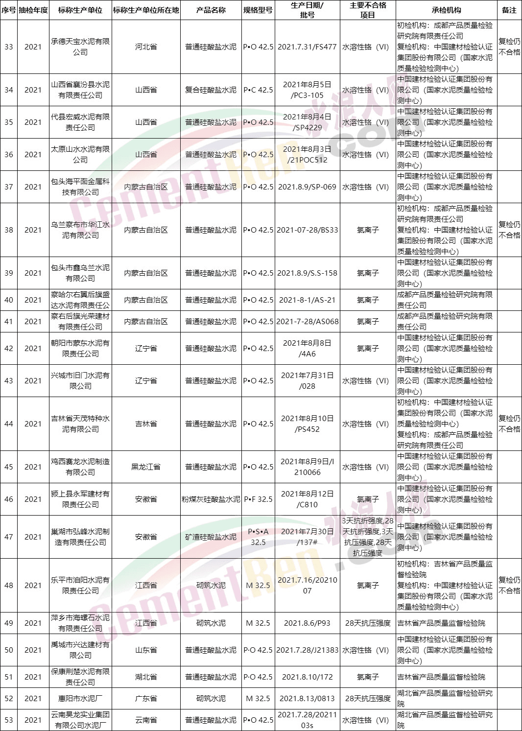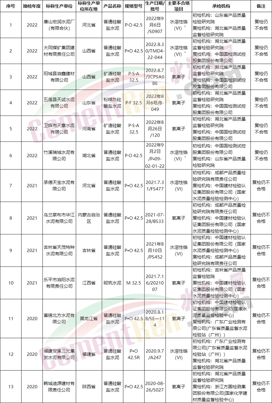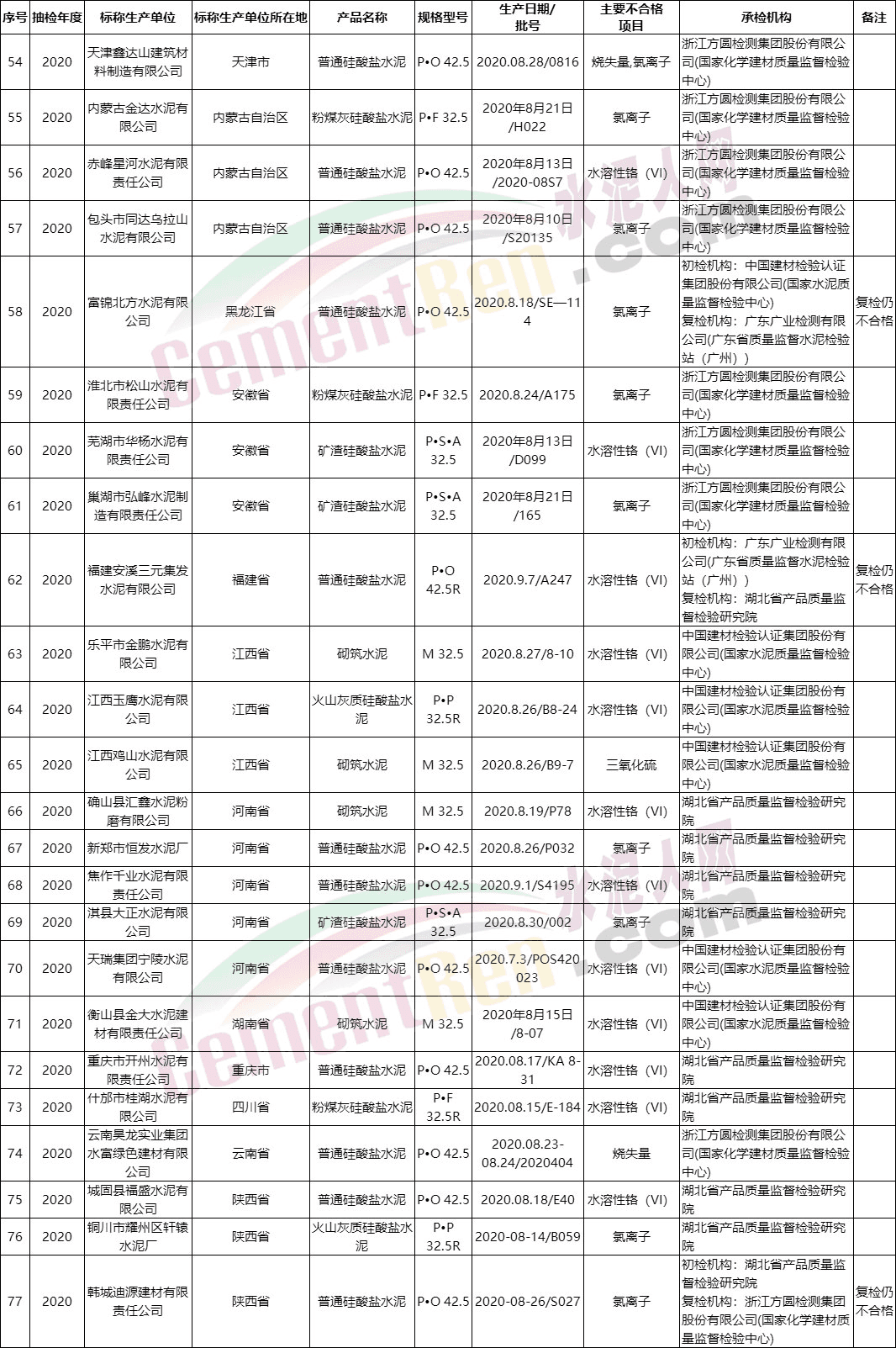 2020~2022年國抽水泥產品不合格名單發(fā)布,共77批次不合格