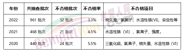 水泥人網注意到,2022年不合格產品較上年增加了11個批次,而且近三年國抽不合格項目中均包含氯離子、水溶性鉻(Ⅵ)。2020年~2022年國抽不合格名單中有13家企業(yè)復檢仍不合格。其中2022年國抽復檢仍不合格的企業(yè)共6個批次,2021年4個批次,2020年3個批次。