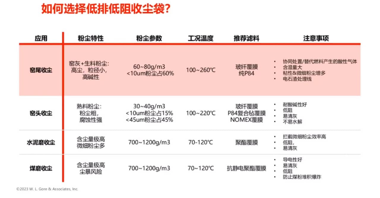 選擇低排低阻收塵濾袋首先需要考慮工藝點粉塵的特性,含塵量,粉塵粒徑,工況溫度(極限溫度和持續(xù)工作溫度)。再根據(jù)工藝特點有針對性地選擇,如是否有協(xié)同處置?是否使用替代燃料,是否添加鋼渣,電石渣、化工廢渣等?以判斷粉塵中的油氣、黏性是否會引起煙氣的酸堿度、濕度的變化。另外,窯頭、窯尾、水泥磨、煤磨各點位因粉塵的特性的不同對上述參數(shù)的要求各有不同。